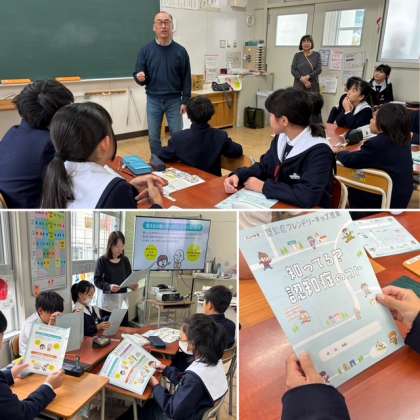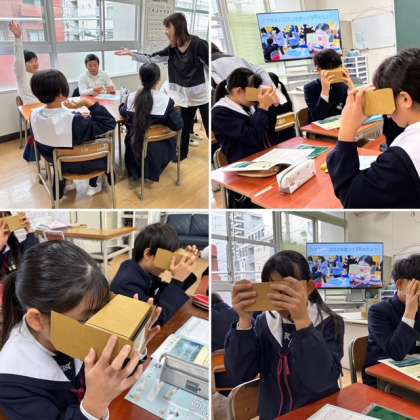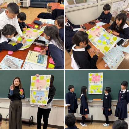 5年生の教室です。朝日新聞社厚生文化事業団の方々や地域の方々をゲストティーチャーとしてお招きし、認知症についての出前授業をしていただきました。未来を担う子どもたちに、認知症のことを正しく理解してもらい、認知症の人に対しての差別や偏見を無くすことを目的とした授業です。はじめに認知症について学び、認知症の人が見ている世界をVRで体験しました。その後、認知症の人の気持ちを考え、認知症の人が暮らしやすい社会にするためにはどうすればいいかをグループで話し合い、ポスターで発表しました。