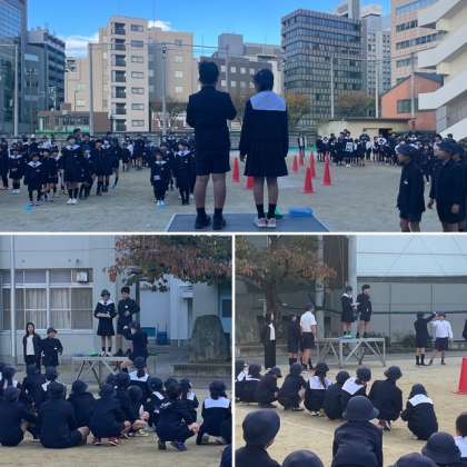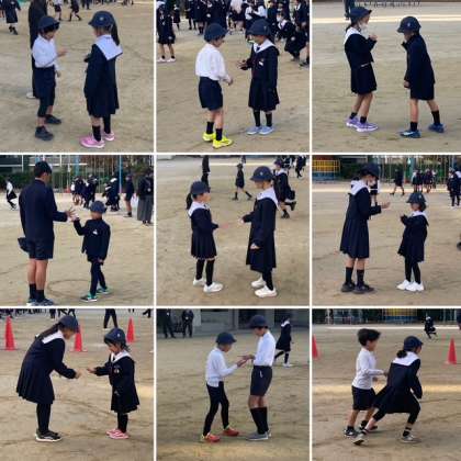 久しぶりに児童集会を運動場で行いました。今回のゲームは「S字ジャンケン」です。各班が2つに分かれて、向かい合ってS字のコースを速歩きし、出会ったところでジャンケンします。勝った人はどんどん前に進み、負けた人は自分の列の後ろに並びなおします。みんなで楽しく盛りあがりました。
