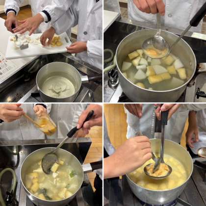 5年生が調理実習をしました。今回は、ご飯とみそ汁に挑戦しました。ご飯は、炊飯器ではなく鍋で炊きました。耐熱ガラス鍋で炊いたので、どのようにご飯が炊けるのかをしっかり見ることができました。「だんだん米が膨らんできている!」「水が減って、鍋の中がグツグツしてきた!」と次々と変わる米の様子を観察しました。普段は、炊飯器のボタン1つで調理できますが、今日の実習で知識が一つ増えました。 みそ汁の実は「油揚げ」「大根」「豆腐」「わかめ」でした。始めに、煮干しで出汁をとり、実やみそを入れておいしく仕上げました。