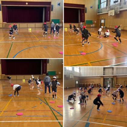 3年生の体育の時間です。表裏で色が異なるディスクを、自分のチームの色にめくっていきます。赤と青、ころころと色が入れ替わり、最後にどちらが多く残ったかの勝負です。チームで作戦を立てながら、楽しく運動しました。