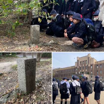 続いては、「陸軍省」という文字が刻まれた標柱が残る大阪城周辺です。かつて陸軍司令部として使用されていた建物の前を通り大阪城へと向かいます。天守閣内部や砲弾痕の残る石垣などを見学しました。