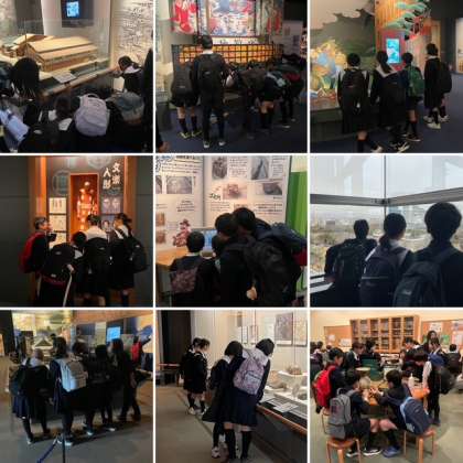 そして、昼食をとったあと、大阪歴史博物館を訪れました。奈良時代の「難波宮」から、本願寺の門前町であった室町時代、豊臣秀吉による大阪城築城を経て、「天下の台所」と称された江戸時代までの大阪の町の変遷、また、大正から昭和初期にかけての「大大阪時代」が再現された展示を見学しました。6年生にふさわしく、平和の尊さや大阪の歴史・文化をたくさん学ぶことのできた社会見学となりました。