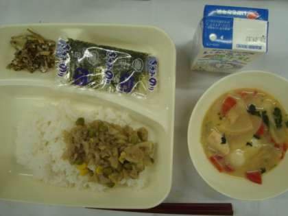 「れんこんのちらしずし ぞう煮 ごまめ きざみのり 牛乳」