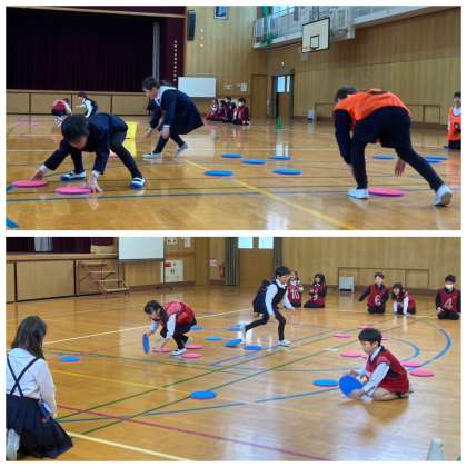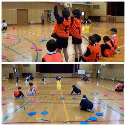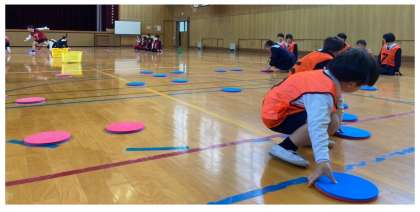 2年生が学級活動で巨大リバーシゲームに取り組みました。テーブルゲームのリバーシと同じで、自分のチームの色が多くなった方が勝ちになります。友だちが活動しているときには自然と応援する姿も見られました。楽しい時間を過ごせましたね。