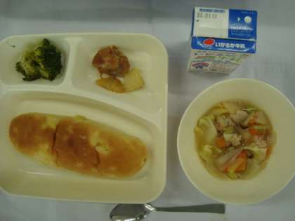 「鶏肉とじゃがいものガーリック焼き スープ煮 ブロッコリーのサラダ おさつパン 牛乳」