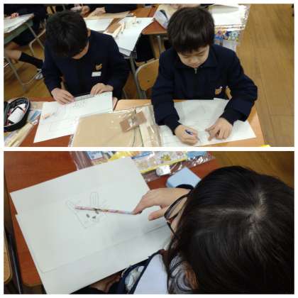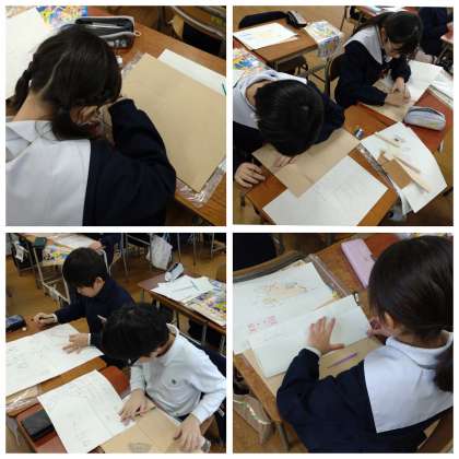 4年生の図画工作の学習では「つくって、つかって、たのしんで」に取り組んでいます。板に線を引いていろいろな形をつくり、組み合わせ方を工夫して作品にします。今回は設計図をかいたり、板に線を引いたりしました。学習が進むと、のこぎりを使って板を切っていきます。