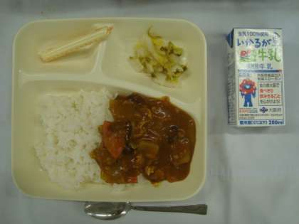 「豚肉と金時豆のカレーライス はくさいのピクルス 棒チーズ 牛乳」