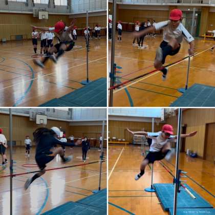 5年生が「走り高跳び」の学習をしている様子です。小学校では「はさみ跳び」と言われる跳び方を基本とします。助走の歩数、入る角度、手と足の振り上げ方、体の向き等、どうすればより高く跳べるかを先生や友達と試行錯誤しながら何度もチャレンジしていました。自己記録を更新したときは「よっしゃー!」と、とても嬉しそうでした。