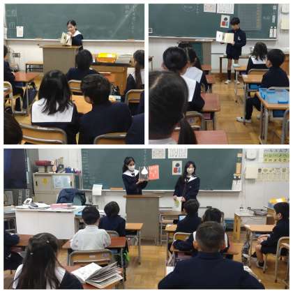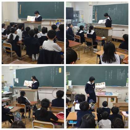 朝の時間に、図書委員会による読み聞かせ活動がありました。絵本の絵が聞く人に見えやすくなるように、本の持ち方や角度などに気をつけたり、聞こえやすい声の大きさで読んだりと、委員会活動での練習の成果を発揮していました。昼休みの図書館開放で、さらに色々な本と出合えるといいですね。