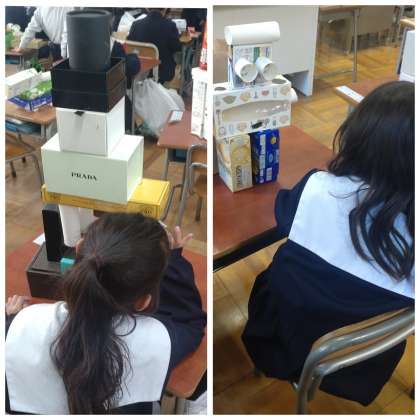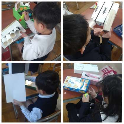 1年生の図画工作では、「はことはこをくみあわせて」の学習で、空き箱を組み合わせて好きなものを立体で表す活動に取り組んでいます。箱の形や色などの特徴を生かすためにどのように組み立てたらいいか、いろいろと試しながら作品を作っていました。