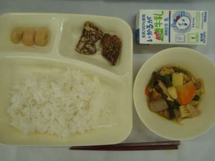 「くじらのたつたあげ 豚肉とじゃがいもの煮もの 白花豆の煮もの ごはん 牛乳」