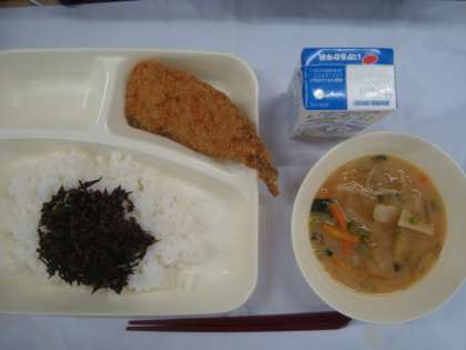 「いわしフライ みそ汁 牛ひじきそぼろ ごはん 牛乳」