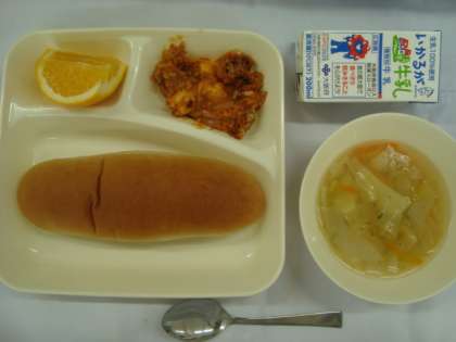 「とうふのミートグラタン じゃがいもと野菜のスープ はっさく 黒糖パン 牛乳」