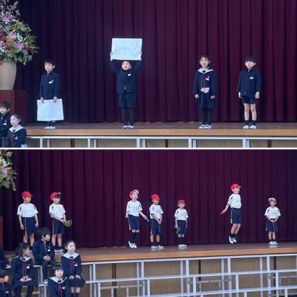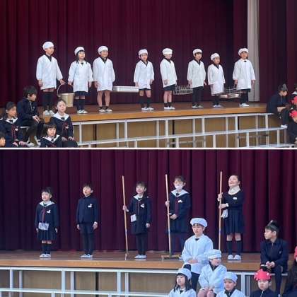 1年生の子どもたちが、来年度の入学式で新しい1年生を歓迎するために行う「お迎え演技」の練習に励んでいます。学習発表会で自信をつけたこともあって、とても堂々とした態度で臨んでいます。