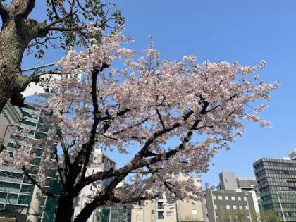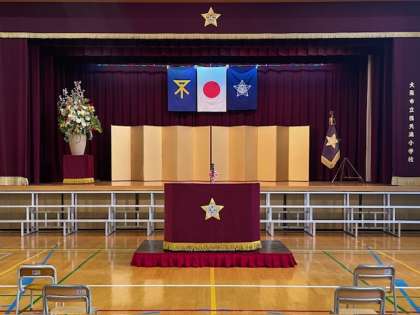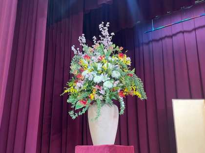 入学式の朝がやってきました。青空に満開の桜が映えとても綺麗です。講堂のお花も整い、いよいよ準備万端です。