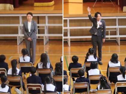 みんなで「がんばります!」と大きな声と決めポーズ。とてもかっこいい42名の子どもたちでした。その後、学級担任の先生やお世話になる先生方の紹介がありました。