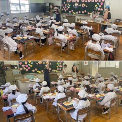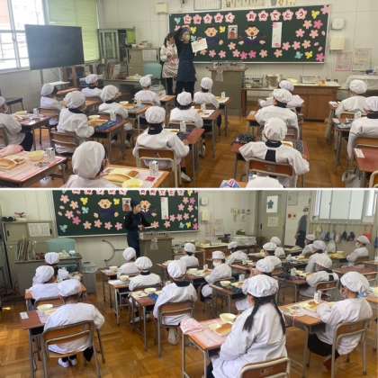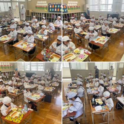 1年生の子どもたちにとって、小学校ではじめての給食時間がやってきました。給食着をきちんと着て、静かに用意をしたあと、感謝の気持ちをこめて、いただきますのあいさつをしました。おいしい笑顔があふれる時間となりました。