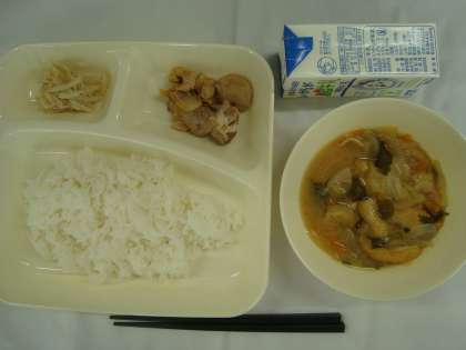 「焼きとり みそ汁 もやしのゆずの香あえ ごはん 牛乳」