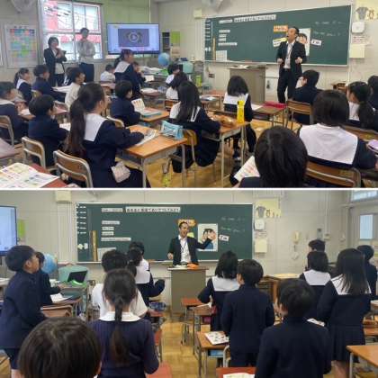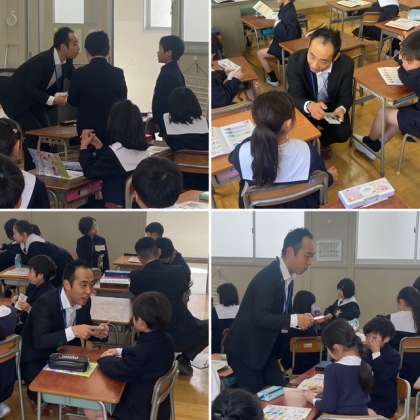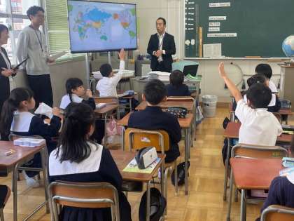 3年生の外国語活動の時間です。ふだんは教育委員会でお仕事をされている先生と一緒に、英語でコミュニケーションをとることの楽しさを味わいました。I'm 〜. や My name is 〜. などの表現を使って、なかよくなるためのはじめの一歩について学びました。