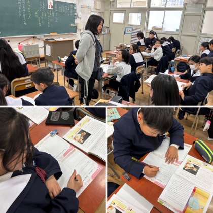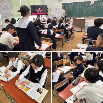 6年生の道徳の時間です。「それじゃ、ダメじゃん」というお話を読み、自分の短所と長所について考えました。落語家の春風亭昇太さんの経験を知った子どもたちから、「自分の短所を隠すのではなく、長所に変えようと努力する姿がすごい!」といった考えが出てきました。いい話し合いとなりました。