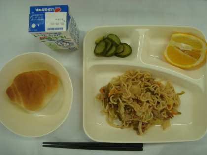 「焼きそば きゅうりのしょうがづけ あまなつかん パン 牛乳」