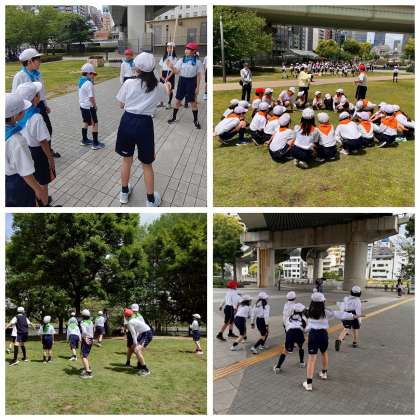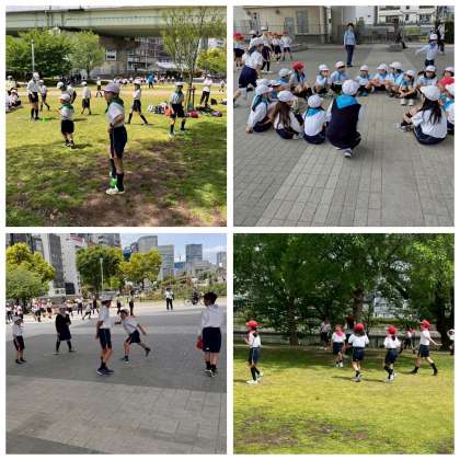 目的地の広場では、体をたくさん動かして、班のみんなで楽しく遊びました。鬼ごっこ、大縄跳び、だるまさんがころんだ、ハンカチ落としなど、笑顔あふれる時間を過ごし、学校へと帰ってきました。5/19の万博訪問の際にも、今回の活動で学んだことをいかして、班のみんなで仲良く協力して活動できるよう頑張りましょう!