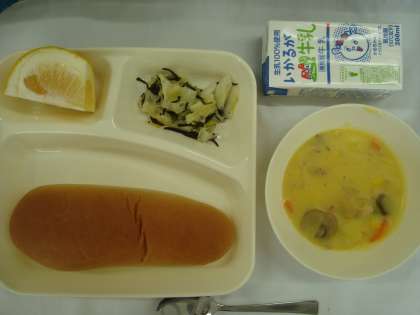 「鶏肉とコーンのシチュー キャベツのひじきドレッシング かわちばんかん 黒糖パン 牛乳」