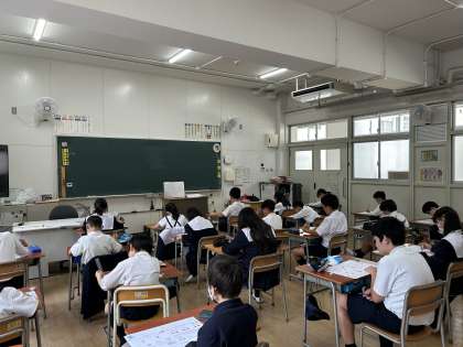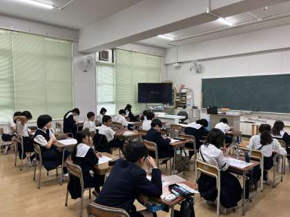 5年生が初めての英語筆記テストに挑戦しました。少し緊張しながらも、集中してリスニング問題に取り組んでいました。Great job everyone!!
