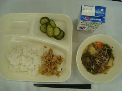 「肉じゃが きゅうりの酢のもの ごまかかいため ごはん 牛乳」