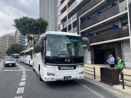 前半の1班〜6班がバスに乗り込みました。いよいよ万博に向けて出発します。