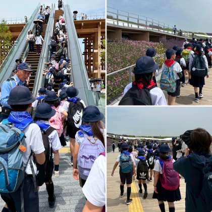 グループごとの見学が始まりました。このグループは、大屋根リングにのぼり、会場全体の雰囲気を味わっています。