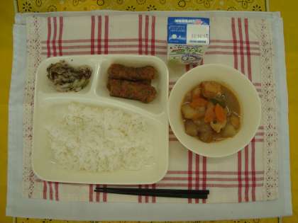 「ちくわのいそべあげ あつあげとさといものみそ煮 キャベツの赤じそあえ ごはん 牛乳」