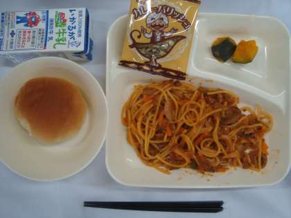「ミートソーススパゲッティ 焼きかぼちゃ カレーフィッシュ パン 牛乳」