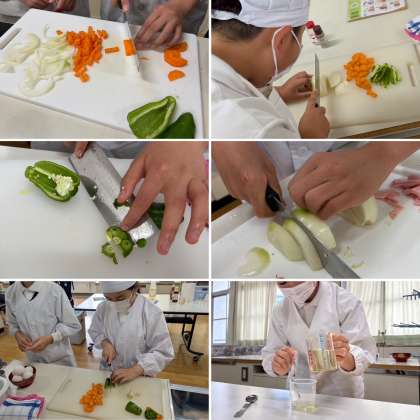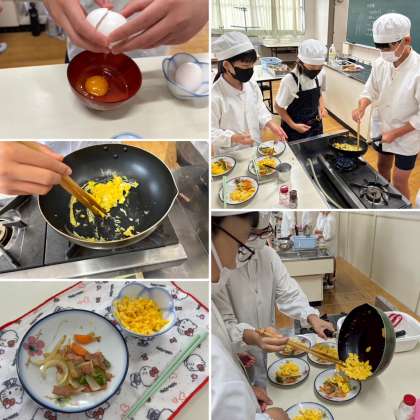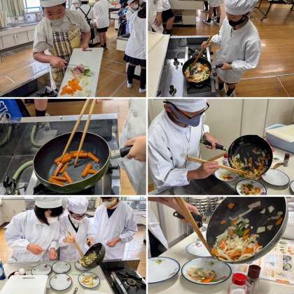 6年生が家庭科の調理実習で「野菜いため」と「スクランブルエッグ」に挑戦しました。包丁の使い方や火加減に気をつけながら、グループごとに協力して調理を進めました。できあがった料理を試食すると、「自分たちで作った料理は特別おいしい!」と笑顔があふれていました。片付けまでしっかり取り組み、達成感を味わうことができた実習になりました。