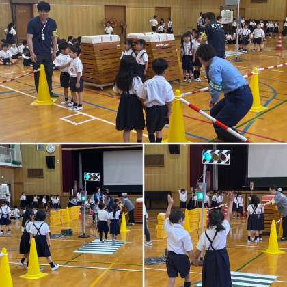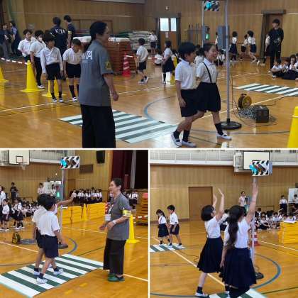 天満警察と北区のあんまち隊の方々に、交通安全指導をしていただきました。信号や標識をしっかりと確認し、自分の命は自分でしっかり守ることが大切だということを教わりました。今日の学習で学んだことをこれからの生活に生かして、安全に過ごしてほしいと思います。