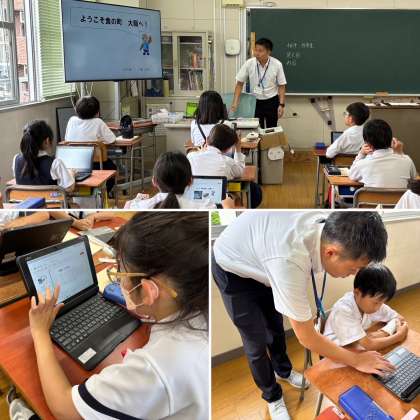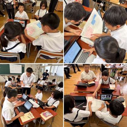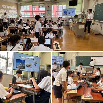 本校では「協働的な学びを通して互いに高め合う子どもを育てる」をテーマに授業研究会を実施しています。今回は、4年生の総合的な学習の授業を行いました。まずは担任の先生が、大阪府のことをPRするプレゼンテーション資料を提示しました。子どもたちは、その資料から「良かったところ」「工夫が必要なところ」を見つけていきました。そして、一人一人の意見を班で伝え合い、より考えを深めていきました。文字の色の工夫、適切な文量、効果的な写真の選び方など、プレゼンテーションをする相手のことを考えた視点に、自ら気付くことができました。次の時間からは、一人一人がミニ観光大使になりきって、各都道府県をPRするプレゼンテーション資料を作成します!
