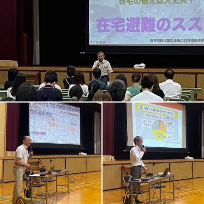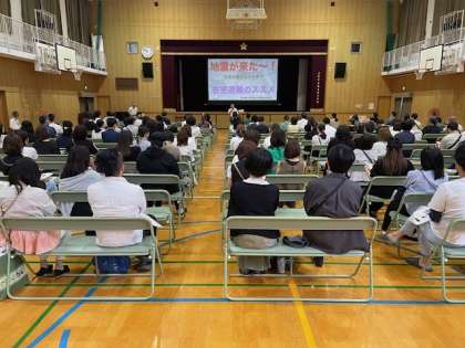 授業参観終了後、体育館で保護者対象の防災講演会を行いました。地域の防災部と区役所の防災担当から講師をお招きし、地震災害や在宅避難等について詳しくお話しいただきました。