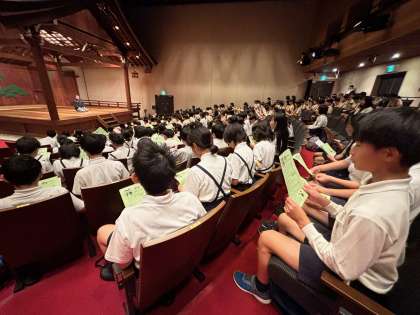 6年生が、大槻能楽堂で「能」と「狂言」を鑑賞してきました。静寂の中に響く謡や、緊張感のある舞の美しさ、そして狂言の軽妙なやりとりに、子どもたちは自然と引き込まれていました。また、能の謡(うたい)の歌い方も実演を交えて教えていただきました。実際に声を出して体験することで、子どもたちは伝統芸能への理解を一層深めることができました。日本文化の魅力と奥深さを肌で感じられる、とても有意義な一日となりました。