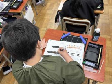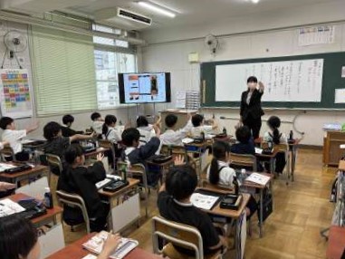 3年生の子どもたちにとって、2回目の毛筆学習です。横画の練習を中心に学習しました。「トン・スー・トン」を合言葉に、ていねいにゆっくり集中して取り組みました。