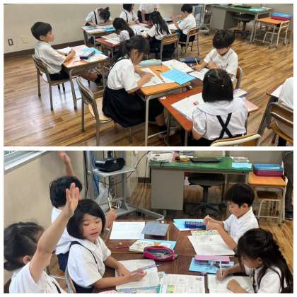 2年生の算数では、問題文を読み、テープ図を使ってどんな式になるのかを考える学習をしています。図にかくことでどんなよさがあるのかを、一人で考えたり、友だちと話して考えたりしながら問題に取り組んでいます。