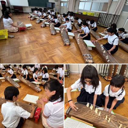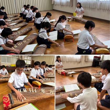 6年生で、お琴の学習がスタートしました。「ちょっとむずかしそう...」と最初はドキドキしていた子どもたちですが、実際にお琴の前に座って音を出してみると、「お〜!きれいな音!」とにっこり。まずは基本の姿勢や、爪のつけ方、そして右手で一音一音ていねいに音を出すところから教わりました。なかなか指が思うように動かず苦戦する子もいましたが、少しずつコツをつかんで楽しそうに弾いていました。