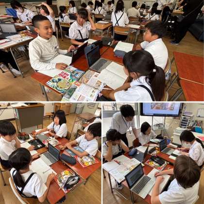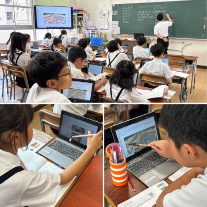 本校では「協働的な学びを通して互いに高め合う子どもを育てる」をテーマに授業研究会を実施しています。今回は、6年生の社会「歴史」で授業を行いました。子どもたちは、「なぜ、古代の人々はあんなにも大きな古墳をつくったのか?」という問いをもとに学習を進めました。タブレットを活用して情報を集め、自分の考えをノートにまとめた後、グループで意見交流をしました。最後は全体で意見を共有し、古墳が単なるお墓ではなく、大きな力を示すためのものでもあるということに気づくことができました。