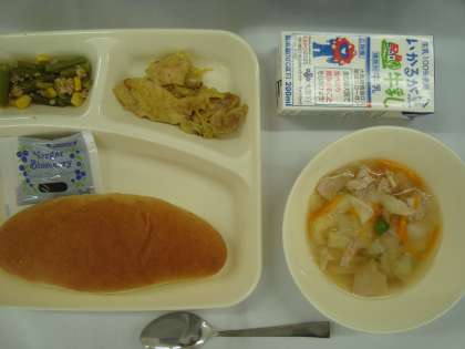 「鶏肉のカレー風味焼き スープ ツナとさんどまめのソテー コッぺパン ブルーベリージャム 牛乳」
