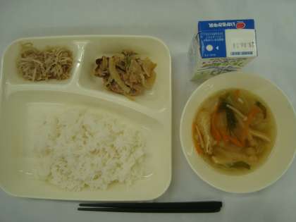 「豚肉のごまみそ焼き 五目汁 ツナともやしのいためもの ごはん 牛乳」