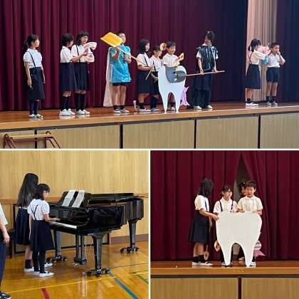 今回の児童集会では、健康委員会の子どもたちが「歯みがき啓発」として、楽しい劇を見せてくれました。虫歯からみんなの歯を守る「ハミガキマン」が登場し、ユーモアも交えながら、歯みがきの大切さをわかりやすく伝えてくれました。劇のあとは、歯みがきのポイントをオリジナルの歌で教えてくれました。これからも毎日の歯みがきをがんばりましょう!