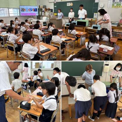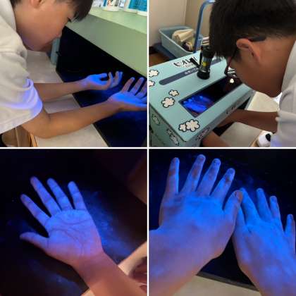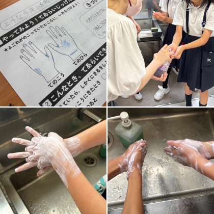 ハクゾウメディカル株式会社の方を講師にお迎えして、1年生と6年生に手洗い指導をしていただきました。手には見えない汚れがたくさんあることを教えてもらい、ブラックライトを使って自分の手をチェック!「ちゃんと洗ったつもりだったのに…」と驚いている子もたくさんいました。その後、正しい手洗いの仕方を教わりました。これからは、手のひらだけでなく、指の間や爪のまわりまでしっかり洗えるようになれそうです。