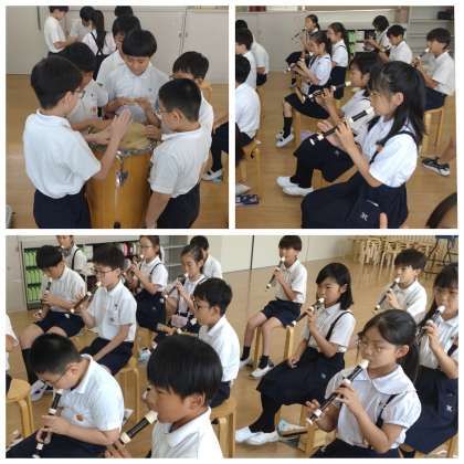 4年生は、音楽の学習で楽器の演奏を頑張っています。今回は「いろんな木の実」という曲に合わせて、様々な楽器を演奏して音の重なりのよさを感じました。また、リコーダーで8分の6拍子の曲「風のメロディー」を演奏しました。授業後には、楽器の音色が気に入って、もっと演奏したいという子がたくさんいました。
