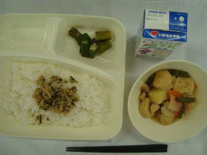 「鶏肉と一口がんもの煮もの オクラの梅風味 ツナっ葉いため ごはん 牛乳」
