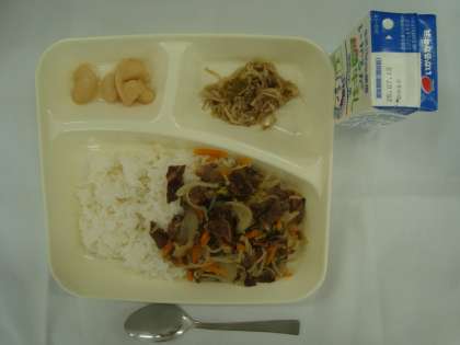 「牛丼 もやしとピーマンのごまいため 大福豆の煮もの 牛乳」