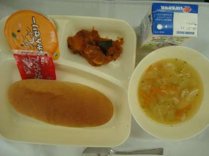 「かぼちゃのミートグラタン スープ みかんゼリー パン いちごジャム 牛乳」